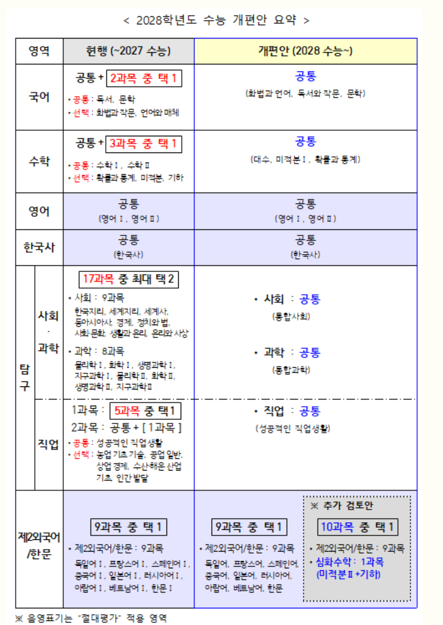 2027년 시행되는 2028학년도 수능부터 선택과목이 없어지고 국어, 수학, 사회, 과학탐구, 직업탐구 영역 모두 공통과목으로 바뀌게 됩니다.